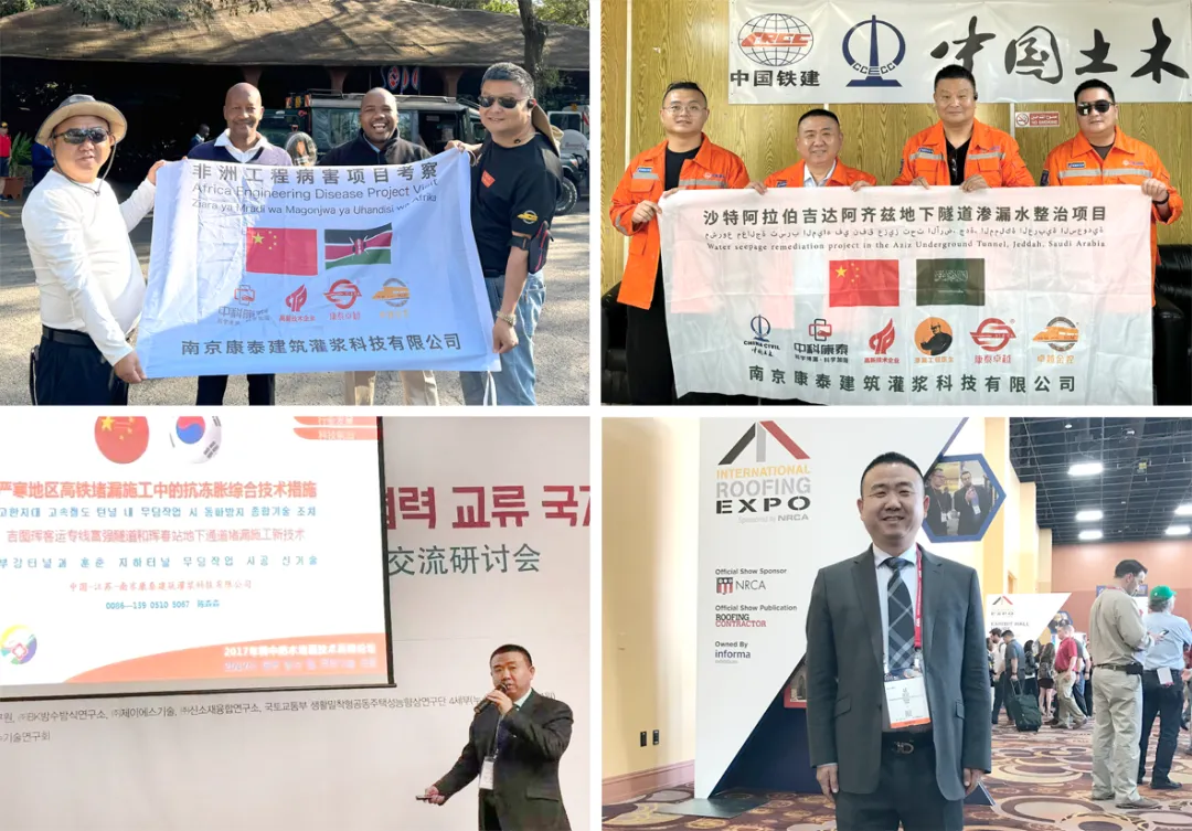 图片说明| 上左:陈森森与文忠在肯尼亚考察工程病害;上右:陈森森与文忠在沙特帮助中国土木集团诊断隧道渗漏问题;下左:2017年,陈森森在韩国首尔与韩国防水届专家交流严寒地区高铁堵漏施工抗冻胀综合技术措施;下右:2017年,陈森森在美国观摩世界防水堵漏技术展览会。