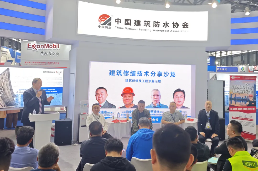 图片说明| 在2025年上海国际屋面与防水技术展览会期间,陈森森应邀参加中国建筑防水协会组织的“建筑修缮技术分享沙龙”。台上嘉宾中,左一为陈森森,左二为文忠。