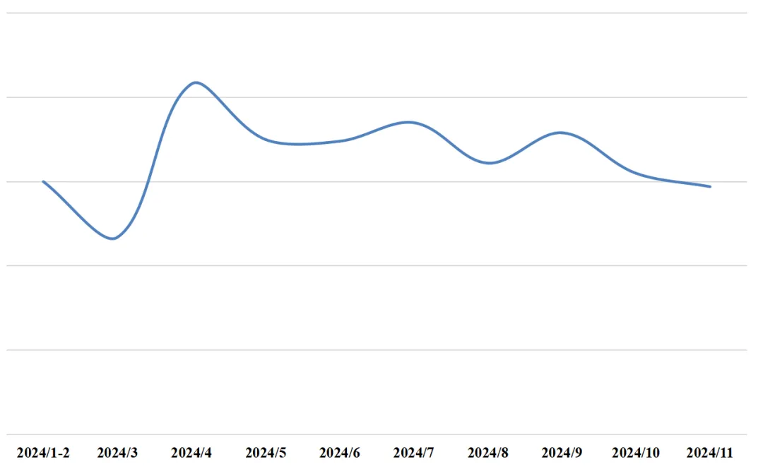今年前11月规上企业累计工业增加值增速较去年同期增长近5个百分点,11月单月增速较去年同期减少近6个百分点。分月来看,1-3月均处于低位,4月达到峰值后有所回落,5-9月期间小幅波动,10、11月有所下降,11月单月低于年初的水平。