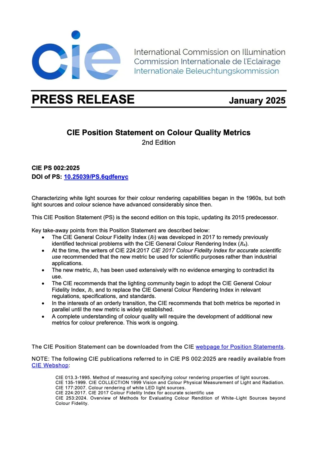 1月,国际照明委员会针对光源显色品质问题发布最新立场声明(CIE PS 002:2025),白光光源显色品质量化研究始于二十世纪六十年代,截至目前,光源技术与颜色科学均取得了显著进步。此项CIE立场声明将对照明行业产生深远影响。长久以来,显色指数一直是衡量白光光源显色品质的“黄金标准”。如今,CIE认为颜色保真度指数Rf应用已成熟,故建议其逐步取代传统显色指数。同时,在CIE有关光源显色品质发布的两版立场声明中,均强调了全面表征光源显色效果(特别是光照颜色偏好)的必要性。七