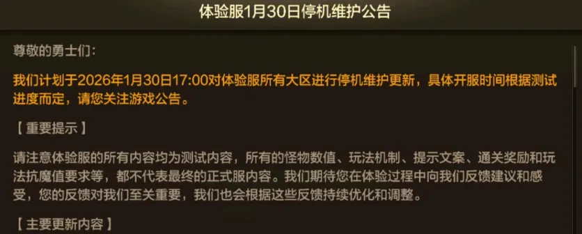 1. 体验服1.30维护,困难安图恩竞拍道具价格下调,商城与商店上架6款礼包,封印之锁确定为7阶颜色徽章,新增增幅、属强徽章礼包,极天幻翼天空套升级活动与新光环上线。