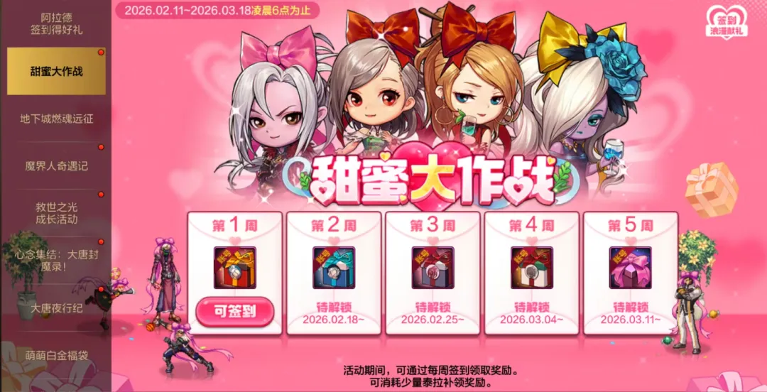 2. 甜蜜大作战分5周发放奖励,最终粉色蝴蝶结装扮要3月份才能领到。