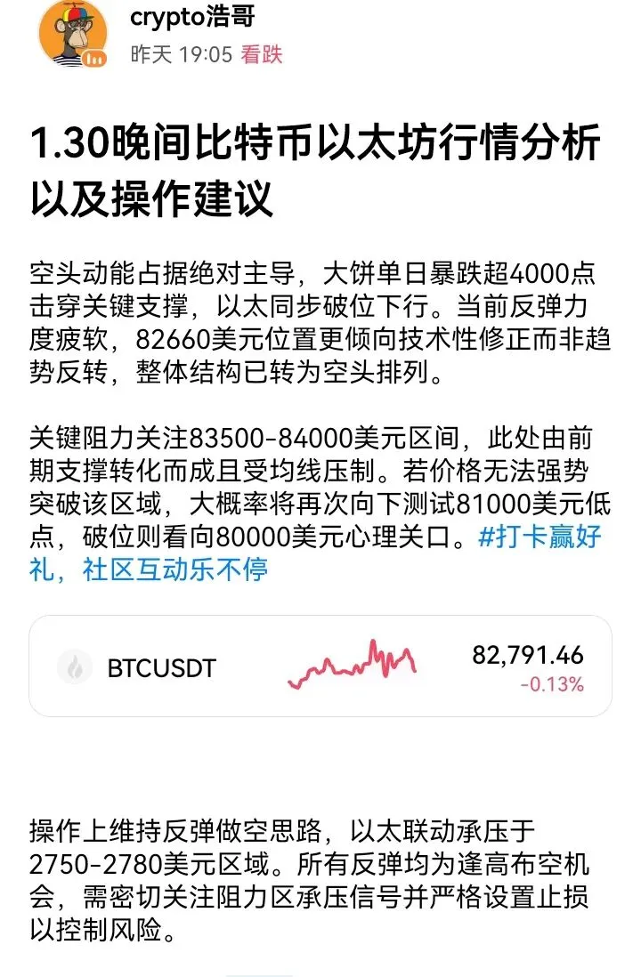 目前价格回落至82700美元一线,若持续无法有效站稳83500美元上方,则震荡格局可能向空头倾斜。下一关键支撑位于82000-81500美元区域,若区间下沿82500美元被跌破,则下行风险将进一步加大。