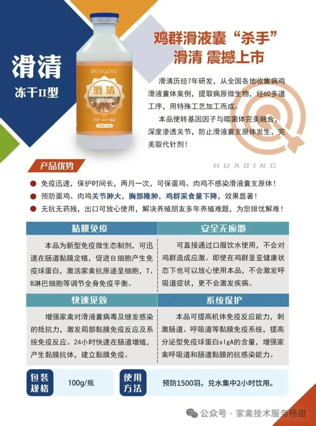 饮水高效预防滑囊问题。24小时提高滑液囊MS抗体系数、超长保护期。真正做到滑液囊疫苗全程不打针饮水使用,抵抗鸡群滑液囊问题。为我们养鸡养殖道路保驾护航!