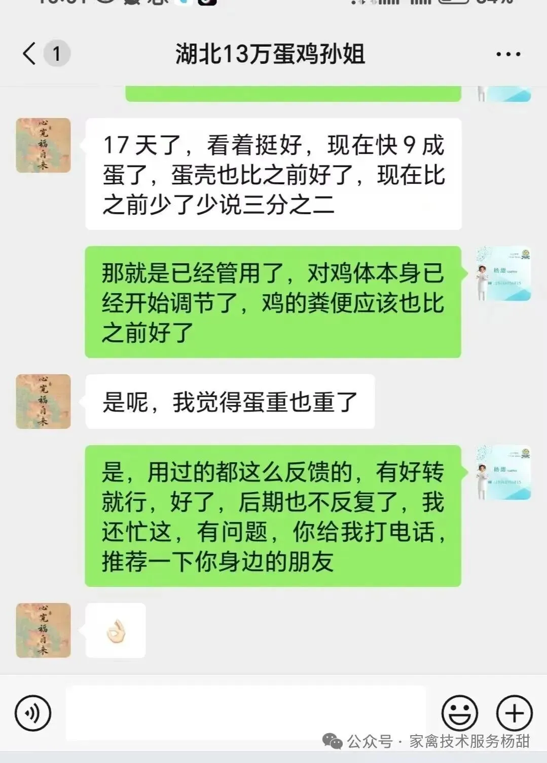 一段时间之后杨老师联系了孙姐,打听家里用滑清那批鸡怎么样了。据孙姐描述这批鸡用了17天时,回访,蛋成长到9成,蛋壳品质也有好转,蛋重和肠道之前好了。