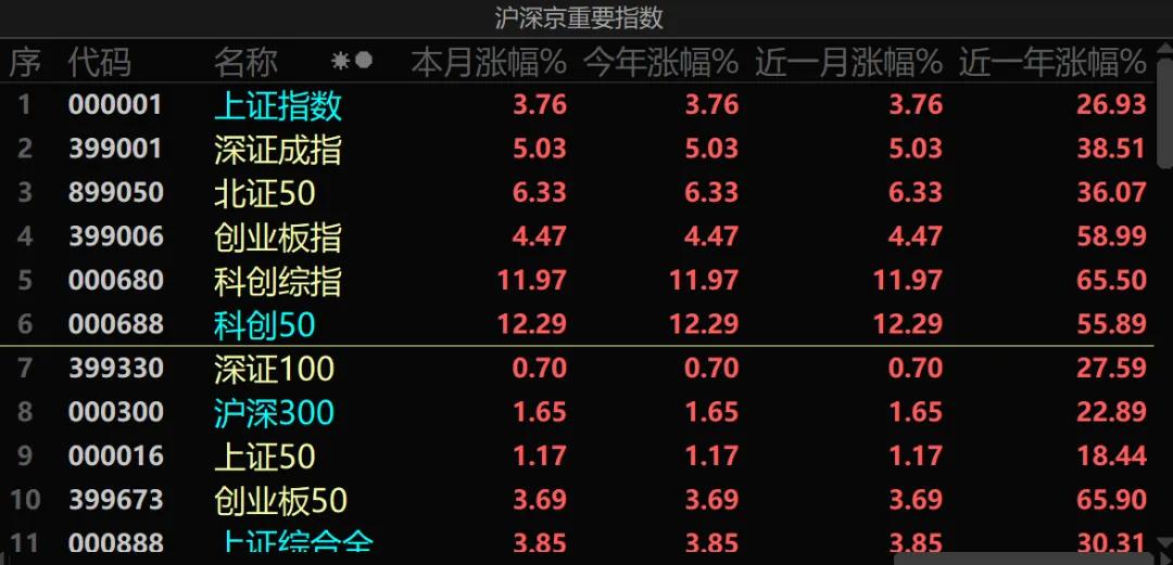 总结,只有深证50出现不到1%微跌,其余众多重要指数都是涨的,很多两位数上涨幅度。