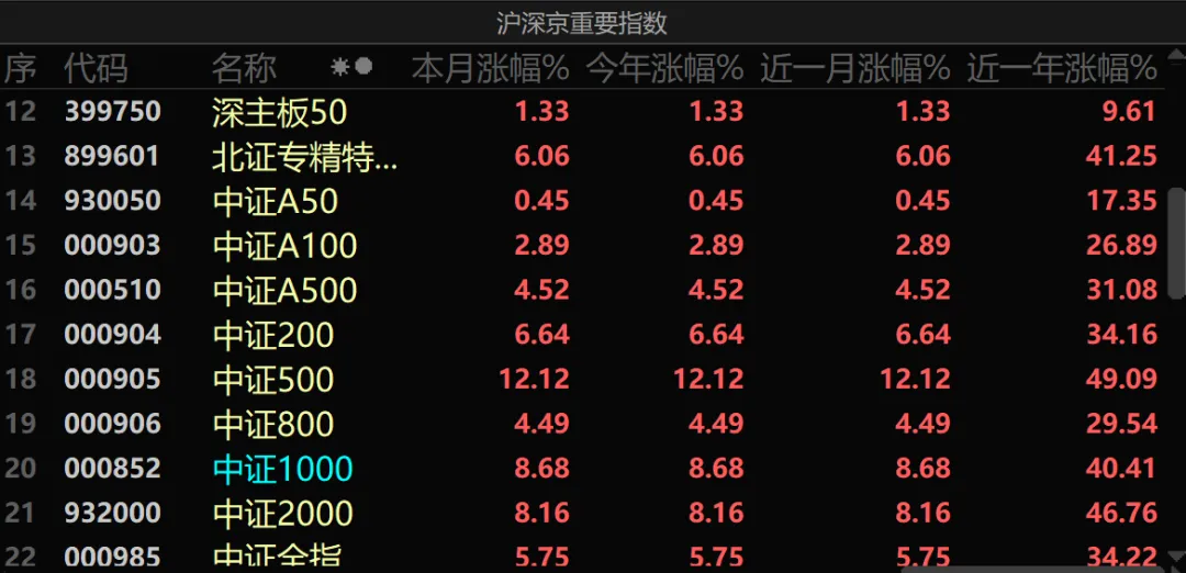 上图可以看到中证500是所有中证指数中涨幅最大的,一个月12%幅度,中证500近一年也有近50%涨幅。