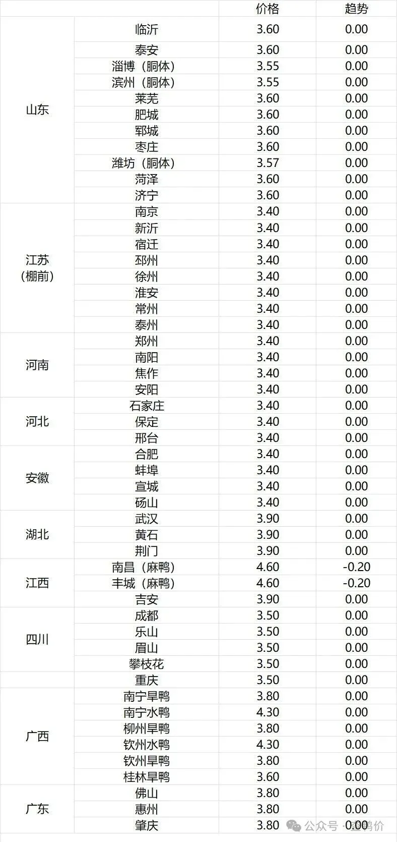 微评:鸭苗报价稳定。(注:南方只报当天价格)合同落的较快,补栏情绪逐步谨慎。根据产品、养殖成本及鸭苗现状分析,预计近期鸭苗价格呈稳中微调趋势。种蛋报价稳定。温馨提示:该价格为主流厂家报价,实际销售价格以成交价格为准,价格仅供参考。