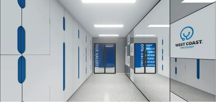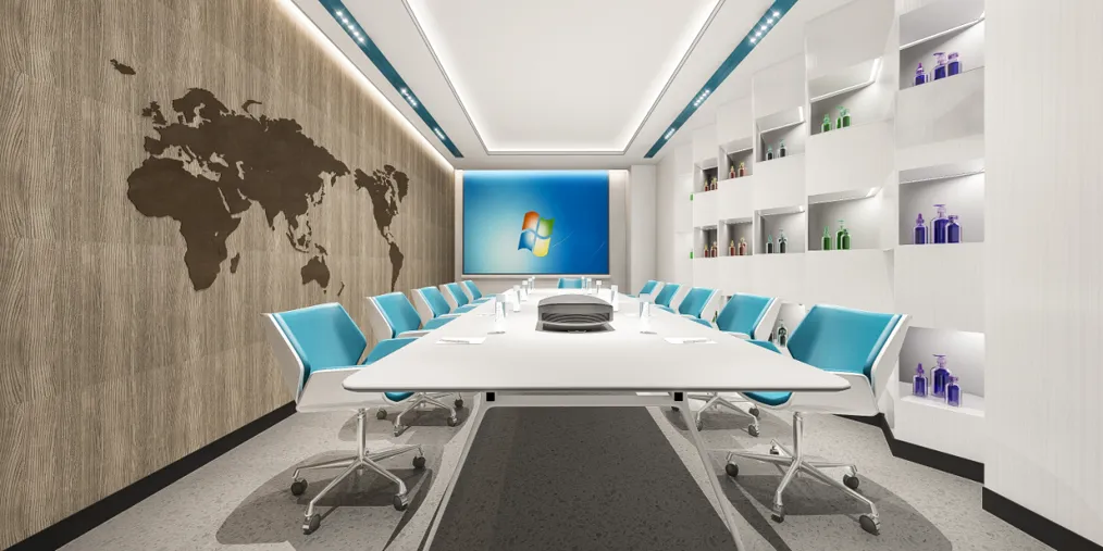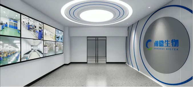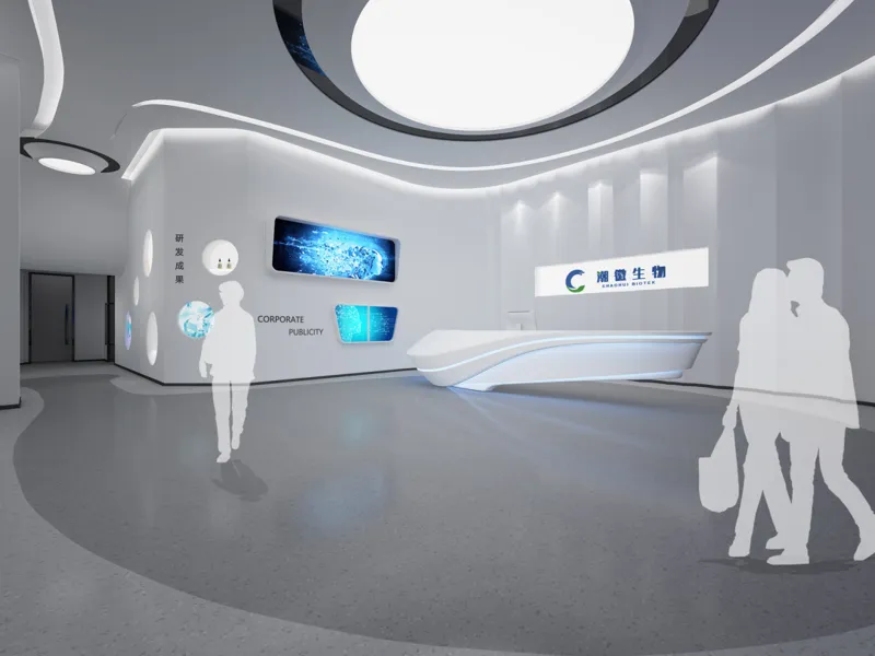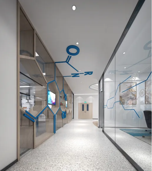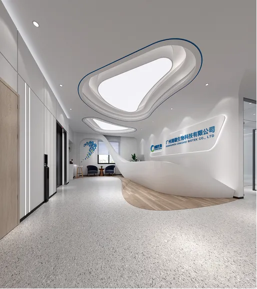 潮徽生物科技(广州)位于广州增城实验研发、生产、办公一体的办公楼,四周均有优越的景观视野。从潮徽Logo精炼的几何关系以及颜色的组成着手,我们从中演绎出形形色色的曲线圆角矩形以及化学元素的几何图形,成为企业文化的展示界面,成为联系不同区域的媒介,也成为室内场景中的一系列家具与陈设。