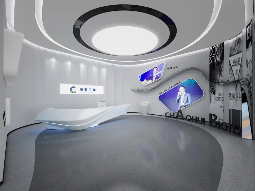 一楼为整栋的接待中心。天花用浩瀚星球加以周边飘带式的曲线灯槽与墙面开剧以焦片式的潮徽历史介绍打开画面,用曲线不锈钢为媒介到科技现代感极强的W造型、曲线墙面呈现,再到不规侧几何屏幕加载潮徽介绍及产品化学元素提炼,泡泡式的产品展示,为客户完美叙说潮徽的过去现在未来的美好愿景。