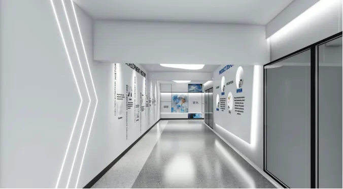 二三四楼为研发生产空间,将专业的杠杆无限延长,把科技加速感融入到电梯间、参观过道