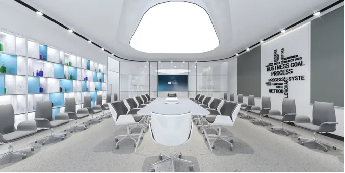 曲线-圆形-方形不同形式呈现接待区及水吧区、研发中心。