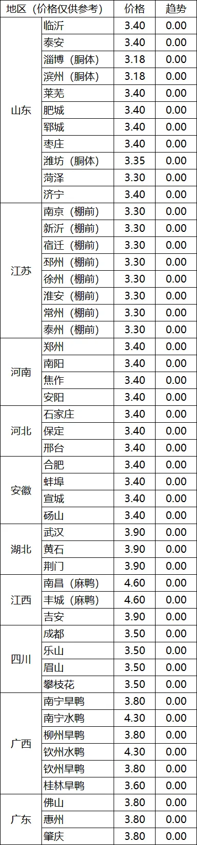 泰安地区肉毛鸡棚前收购价3.80-3.90元/斤,与30日相比持平;