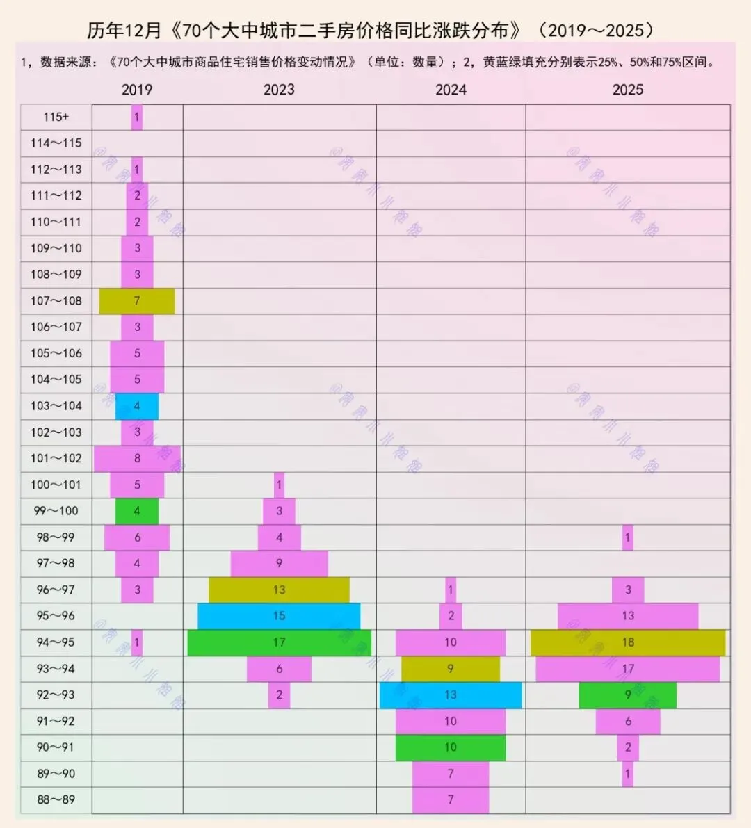 例如,在“98~99”、“97~98”这样的微跌区间,2025年分布的城市数量,显然比2019年时要多出不少。