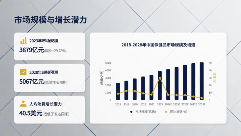 随着国民健康意识的全面提升、人口老龄化进程加快及消费结构持续升级,我国保健品行业历经四十载发展已步入规范化新阶段,成为健康产业中极具增长潜力的核心板块。数据显示,2023年中国保健品市场规模已达3879亿元,同比大幅增长29.78%,预计到2028年将进一步攀升至5067亿元,同比增长19.59%,行业正迎来前所未有的发展机遇。