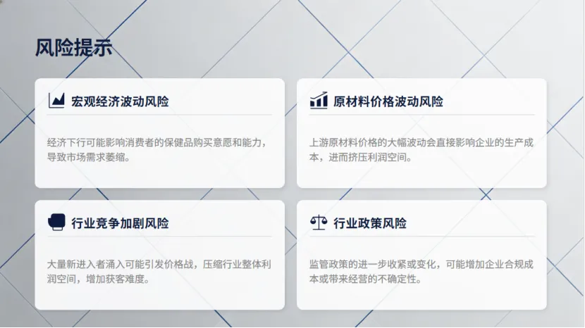 同时,行业发展仍面临多重风险挑战。宏观经济波动风险可能影响行业需求,若经济增长放缓或不确定性增加,将直接冲击保健品消费市场;原材料价格波动风险不容忽视,原材料价格上涨将直接压缩企业利润空间;行业竞争加剧风险可能导致价格体系受冲击,影响行业长期健康发展;行业政策风险仍需警惕,监管部门出台新的法律法规可能增加企业运营成本。业内人士建议,企业需持续强化研发创新、严控产品质量、优化渠道布局,以应对市场变化与风险挑战,在行业规范化发展浪潮中抢占先机。