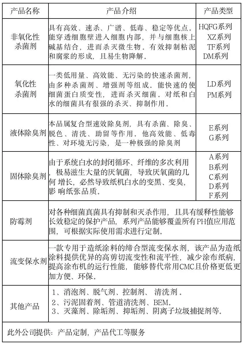 在造纸类化学品行业中,从事造纸类化学品近30年,产品技术经验丰富,服务多家知名造纸企业:太阳纸业、华泰纸业、理文造纸、世纪阳光、岳阳林纸、泉林纸业等。