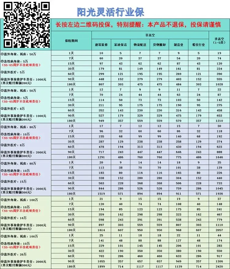 阳光灵活行业保灵活用工意外险:1-5类,保期1/7/15/30天和60/90/180天,最高100万,高空/猝死,餐饮、家政、建筑、物流、制造,装卸