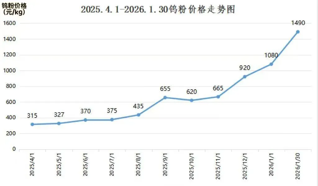2026年1月份钨市场迎来开门红,钨精矿价格从元旦后45.9万元/吨上涨至59.5万元,月涨幅30%,仲钨酸铵APT从年初67万元/吨上涨至89万元/吨,月涨幅33%,钨粉从元旦108万元/吨上涨至149万元/吨,月涨幅37.9%,上游维持强势运行,持货商捂盘惜售,现货资源供应缩量,盘面高位震荡,提振市场氛围,下游企业多以刚需采购为主。