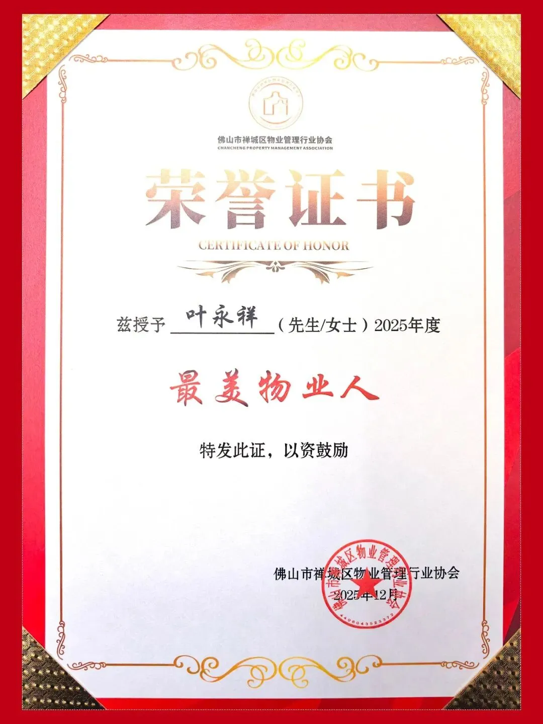 自2016年加入龙光服务以来,佛山天湖郦都项目的叶永详始终坚守工程服务一线,从弱电技术员逐步成长为工程主管。凭借扎实的技术与兢兢业业的态度,他赢得了业主的一致好评。无论是日常设备维护,还是应急抢险任务,他总是冲锋在前,保障园区设施平稳运行。一面面锦旗、一次次致谢,都是对其精湛技艺与真诚服务的最佳见证。他在平凡岗位上绽放光芒,深刻诠释了“最美物业人”的内涵。