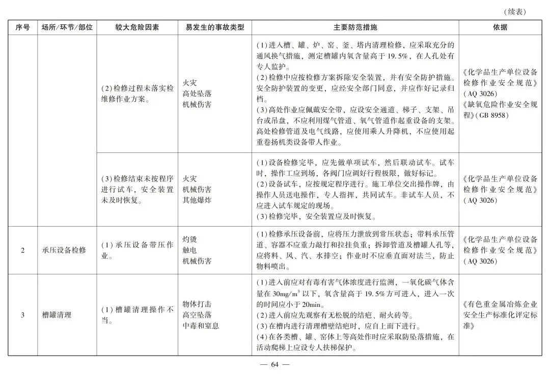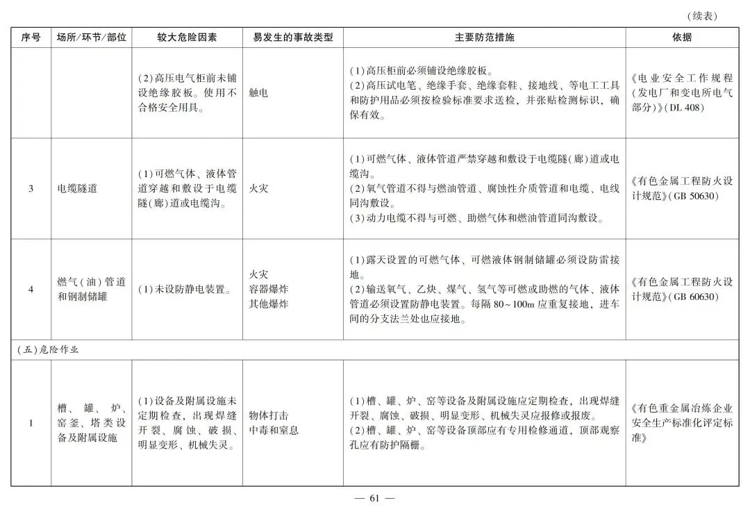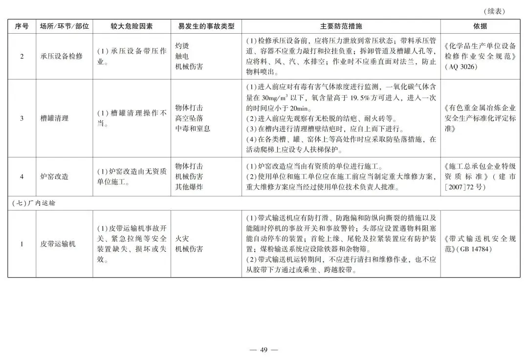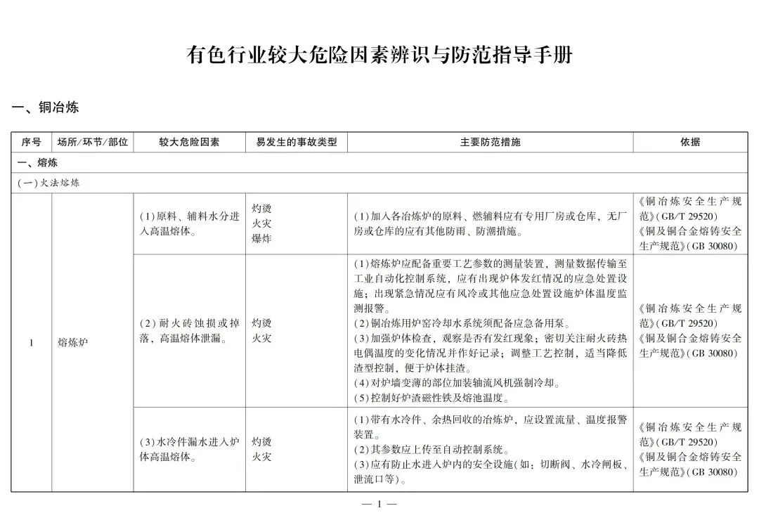 该手册结合了有色行业企业的安全特点,针对易发生较大以上事故的生产作业场所、环节、部位和作业行为,依据国家、行业法规、标准和技术规范,通过吸取相关事故教训,运用对照经验法、类比法、事故分析法等方法,提出了有色行业企业较大危险因素辨识的主要内容及其防范措施,供有关企业在开展较大危险因素辨识及制订防范措施中参考,供监管部门作为重点执法检查内容参考。