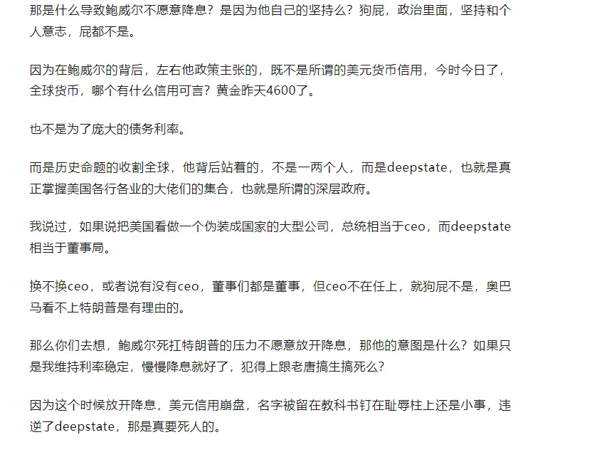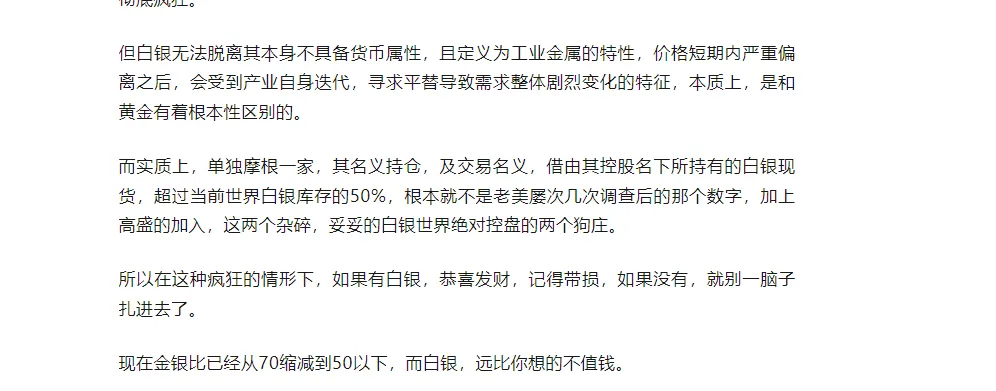 相信贵金属市场,很多人都经历了一个无眠之夜,我不知道有多少人昨夜走上天台,我只能说,昨夜我睡的很舒坦。黄金昨夜跳水,最高位置,5451,最低位置4682,日内最大跌幅12.92%。我嘞个豆,现货跌停,在我近三十年的交易经历里边,也是活久见,极为罕见的情况。经历了如此恐怖的一轮资本清洗之后,我可以毫不夸张的说一句,如果不是你运气极好,你是不可能从网络上的大v们身上找到答案的,更不可能提前获得任何有用的信息,如果你看到这里,那么恭喜你,困扰你的每一个疑惑,你都能从这里找到全解,且独此一家。哈,其实我这个时候无需做任何新的解释,只不过是把我之前的观点统合起来,就能够解释一切,因为我都提前说过了。可以这么说,这一轮黄金和白银的价格之所以跌成这样,白银是元凶。在1月27号,也就是周二的文章,《金银市场极致的疯狂背后,是资本和ai的情绪陷阱》一文中,你可以找到答案。在这一片文章中,我详细叙述了白银疯狂上涨的伪逻辑。白银价格的上涨,根本上,是得益于黄金作为避险资产,遭到全球疯抢,全球央妈囤积黄金,货币开始失信,全球黄金囤积需求叠加,黄金价格上涨。而作为工业金属的白银,被资本强行归类到贵金属行列,因此在黄金价格节节攀升的历史背景下,白银价格也跟着上涨,这是历史背景。但造成12月之后,白银价格和黄金价格,失去控制的上涨,民间黄金回收,甚至出现溢价30元回收黄金之类耸人听闻 ,但确实发生的现象级实事,则是因为先有美国提高了白银储备地位,然后作为全球最大的白银精炼的输出国,我兔也在之后选择把白银转国储。这样的历史背景之下,白银价格在资本和情绪的推动下,彻底在元旦之后,如脱缰的野狗一般,失去了控制。白银价格一路突飞猛进,在突破历史最高的50美元之后,短暂休息便进一步推高,一路走上了癫狂之路,并创下了121的历史最高位。但这种背景下,一个是很多人早已被情绪所左右,听不到谨慎和理性的呼喊,二则是这个龙鱼混杂的网络,本就没多少有真材实料的大v,又哪能看得清这背后所蕴藏的危机与风险?首先在属性上,白银是工业金属,跟贵金属没半毛钱关系。大清亡了,民国结束,这个世界上,哪里还有银本位?没有了。全球央行这几年都在囤积黄金,谁见任何一家央行囤积白银?黄金作为全球唯一具备货币属性的品种,之所以被全球央行追捧,持续买入,是因为需要增加黄金储备,为相应法币,提供货币信用加强,在这种情况下,集中度,是被持续分散的。而白银不同,用大众更能够理解语言来说,那就是白银是庄股。这个黑手,就是摩根,摩根一度控制着全球白银库存的55%以上的库存量,但此举,之后遭到了美国官方的介入,也不是罚一次和查一次的问题了。然后摩根通过拆解拆分,交叉持股的方式,把名义控制量降了下来,但实际上,掌控的白银库存数量,不但没有减弱,反而还在缓慢增加。这两家加入之后,能够掌控和调动现在白银市场,超过70%的白银库存。轧空黄金是可行的,因为全球央行都在买黄金,全世界也都在买黄金,买的最多的,都是非美国家,尤其兔子,官方和民间都在买。因为即便跌了,也可以直接选择交割,而在全球都在买的情况下,交割,天方夜谭啊,在全球停止买黄金之前,这样的情况,还会持续。但白银不同,高盛叠加摩根,如此之大的白银储量,你轧空吧,这些白银,足够全球用多少年有概念吗?然后是美国提高白银地位的历史背景,那是因为,美国每年的精炼白银中,有35%是依靠进口的,其中相当一部分,来自于兔子,因为兔子本身就因为庞大而发达的精炼产业,使得全球年白银的供应当中,有65-70%的产量源自于兔子的供应。现在的时局,大国交锋,老美提高白银地位,没啥问题啊,降低对外部的依赖,应有之意。因为兔子虽然有着全球最大的白银精炼,但现代白银的生产,是在其他矿物提取淬炼的过程中的伴生产物,如铜等,因为受限于我们国内如铜等矿物的品质平均较低的因素,我们需要大量进口矿石,来进行矿物萃取,我们已经是连续二十多年的全球第一大铜进口国。而这些几乎都掌握在必和必拓,淡水河谷等西方矿业巨头手中。现在的模式就是人家给我们矿,我们萃取精炼之后,再把精炼之后的白银等卖给人家,本身关系,是互相上下游的关系,不存在制约关系。因为我们固然在精炼白银是大哥,但人家在矿物上也是大哥。所以兔子在白银上,转入国储,其实至少在目前,是没有太多影响的。可在资本炒作之下,就变味儿了,失去兔子全球年65-70%的精炼白银产能,精炼白银供需失衡了,这65%-70%的产能缺口从何填补?再加上资本市场的布局,大量增加白银库的集中度,高盛和摩根都在从市场上吸收白银流通,某三哥在伦敦市场大量提现白银,也被刻意炒作。于是乎,在兔子没有规模性收紧白银供给,市场需求没有大幅提升的情况下,白银就这么出现了市场性紧缺~白银价格上涨,谁得利?自然是绝对的庄,摩根和高盛,谁都不可能有他们手里的白银多。高盛不知道,但摩根手中绝大多数的白银成本,如果不算后面吸收增持的白银,原始库存只有15美元,而这是绝大多数。庄股之所以恐怖,就在于绝对控股的庄一旦开始抛货,是没有任何人可以接的动的。这是我白银大跌之后才整理出来的说辞吗?不,基本都是上面我说的那篇周二发表的文章之中。当白银价格超过115美元的时候,有几个人想过,控制世界白银库存超过50%的摩根,且均价不过