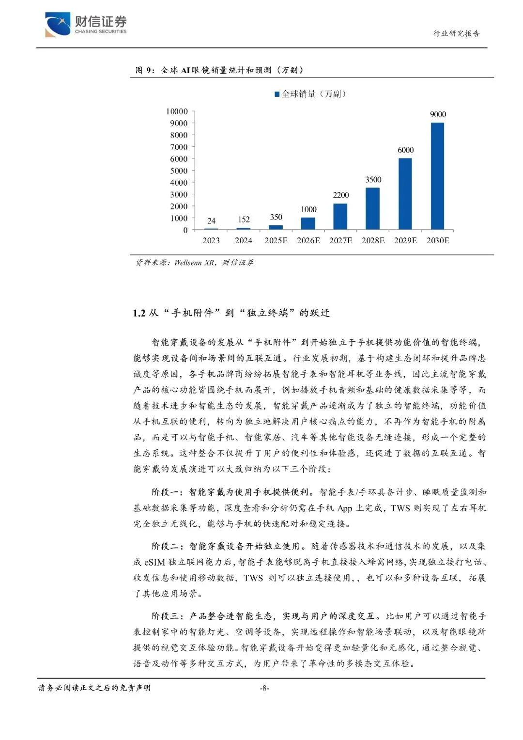 智能穿戴设备的重要价值跃迁为从"手机附件"发展为独立的"智能终端"。智能穿戴设备的首次价值跃迁发生在从过去的手相几附件,进化为能够独立使用的智能终端,并整合进智能生态,为用户带来了视觉和动作等多模态交互体验,成为了重要的流量入口之一。行业目前正处于高质量发展阶段,横向构建以手表、耳机、眼镜等为核心的多品