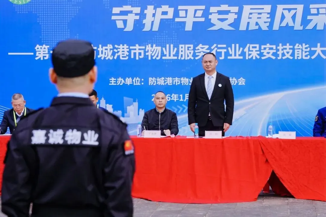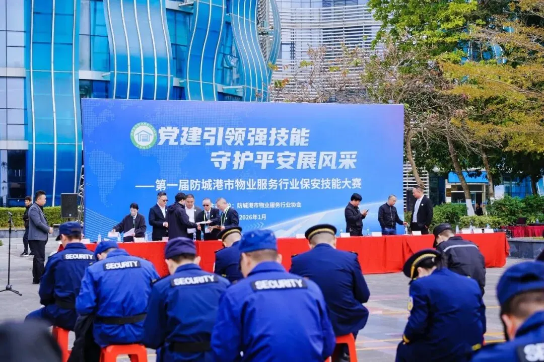 为扎实推进我市全国文明城市创建工作,全面提升物业行业保安队伍专业素养,筑牢城市安全防线。2026年1月28日,第一届防城港市物业服务行业保安技能大赛在防城港市妇女儿童活动中心场地隆重举办。本次大赛以“以赛促学、以赛促练”为宗旨,搭建物业保安技能交流展示平台,吸引了本市金碧物业、华保盛物业、绿联物业、安信物业、中天世纪物业、和谐智慧物业、嘉诚物业、龙光物业、凯怡物业、碧桂园物业共10支物业队伍同台竞技、比拼风采,展现新时代物业保安的专业素养与责任担当。