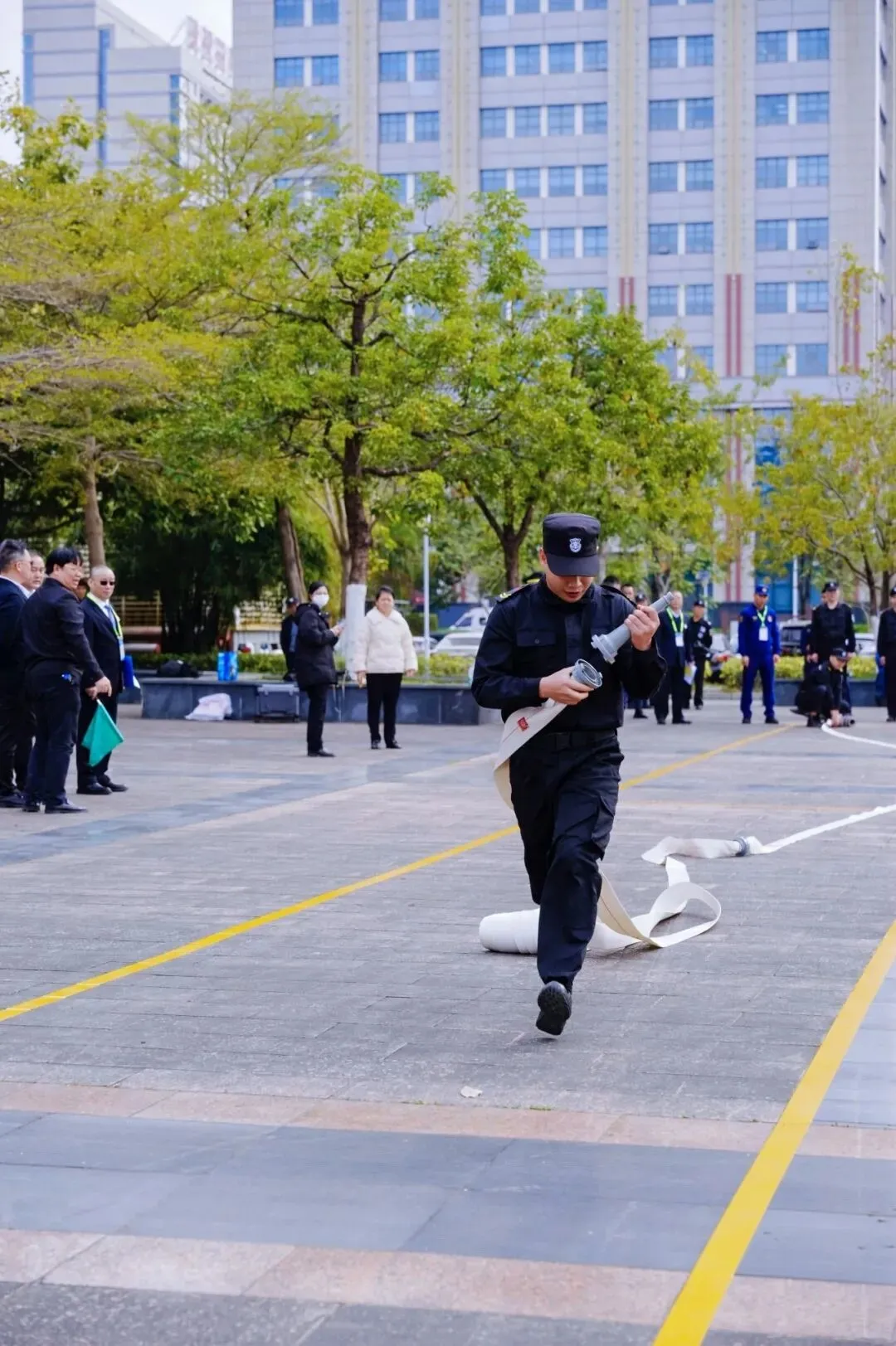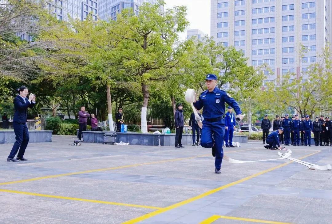 比赛环节紧张有序、亮点纷呈,分为团队项目与个人项目两大板块,全面检验物业保安的专业技能与综合素养。团队赛中,各参赛队伍依次开展形象展示与队列会操、车辆指挥、擒敌拳表演、消防水带抛接项目比拼,动作规范标准、配合默契娴熟,队列会操整齐划一,擒敌拳刚劲有力,车辆指挥手势标准规范,消防水带抛接快速精准,充分展现了物业保安过硬的专业技能、良好的精神风貌以及应急处置的实战能力,赢得现场阵阵掌声。个人项目设置理论知识笔试,重点考查参赛队员对保安专业知识、消防安全规范、应急处置流程等内容的掌握程度,检验其专业知识储备,实现“以赛验学、以学促能”的目标。