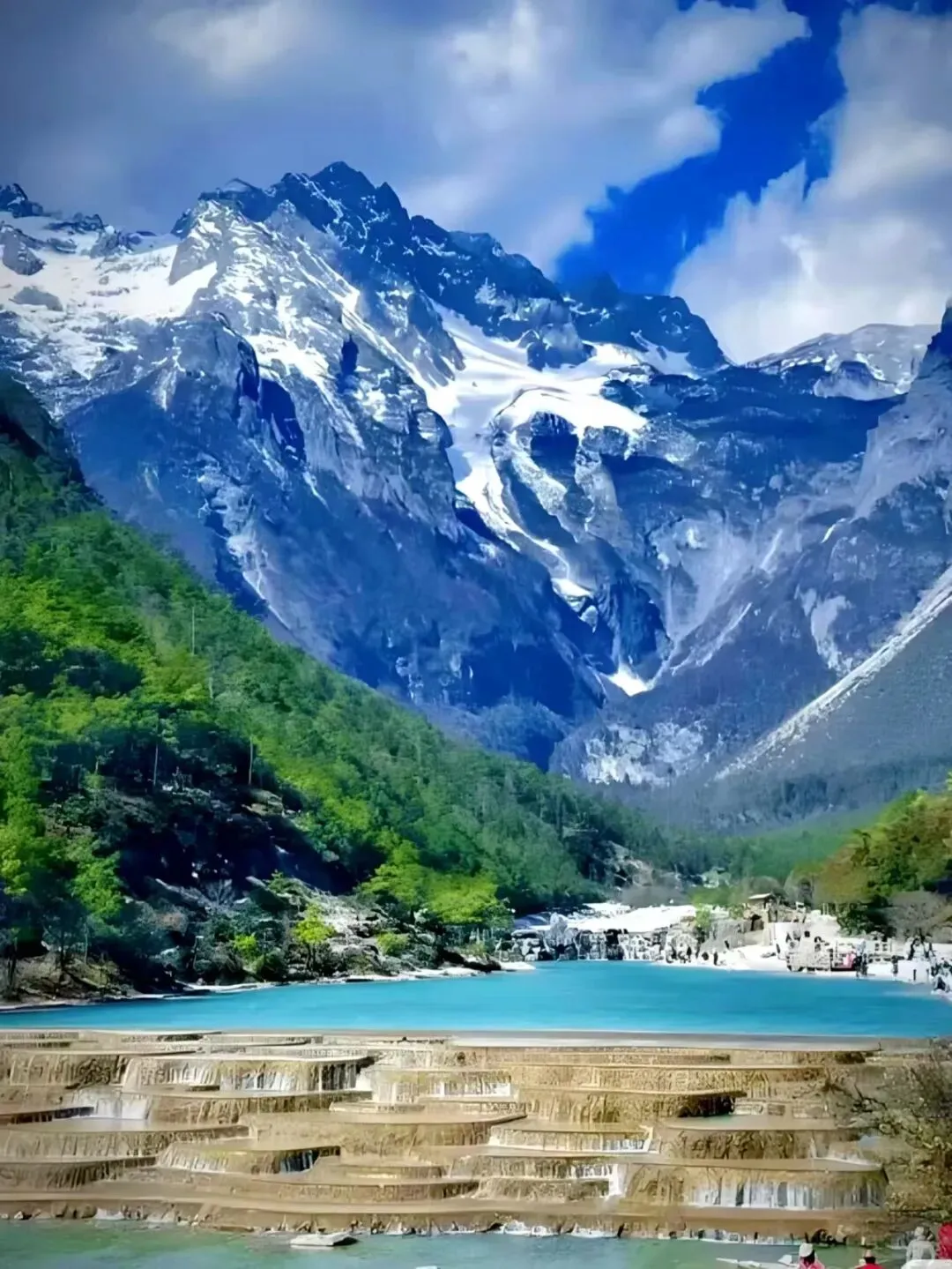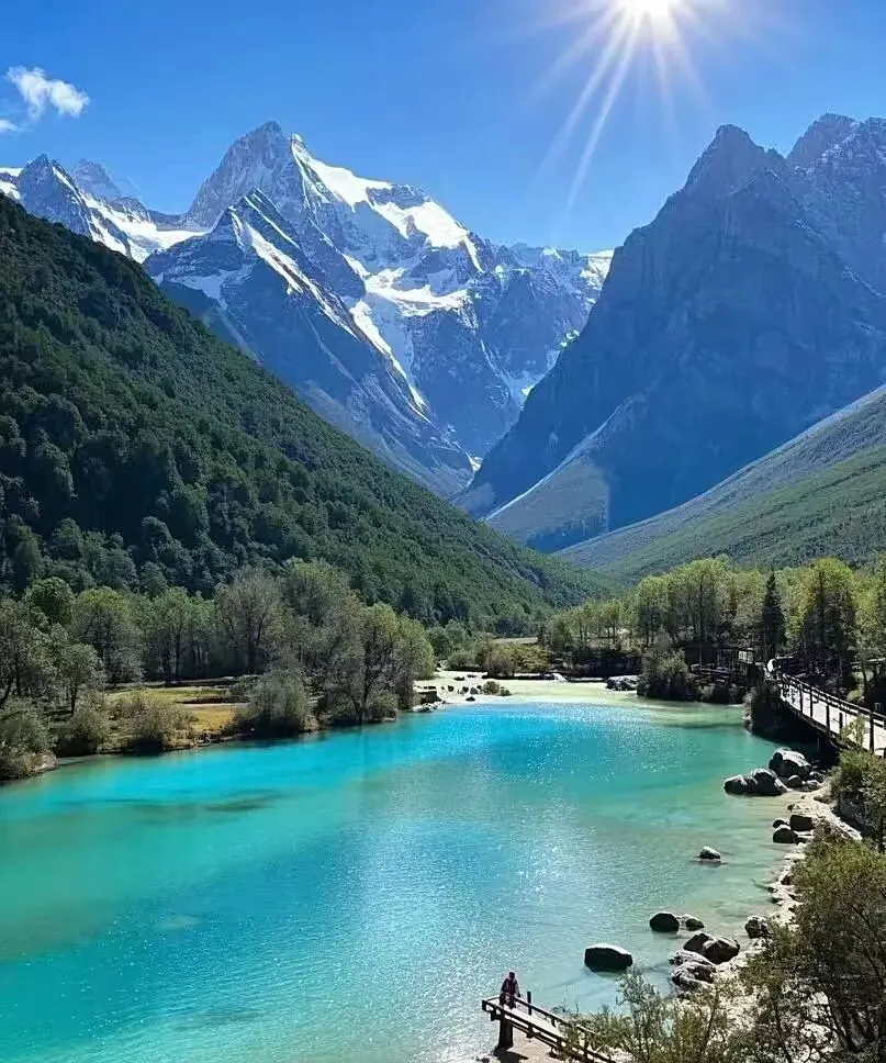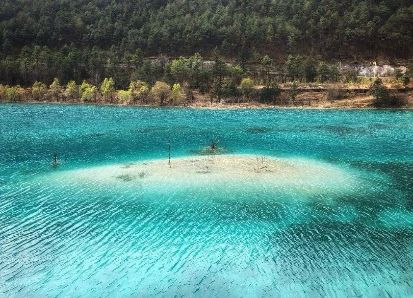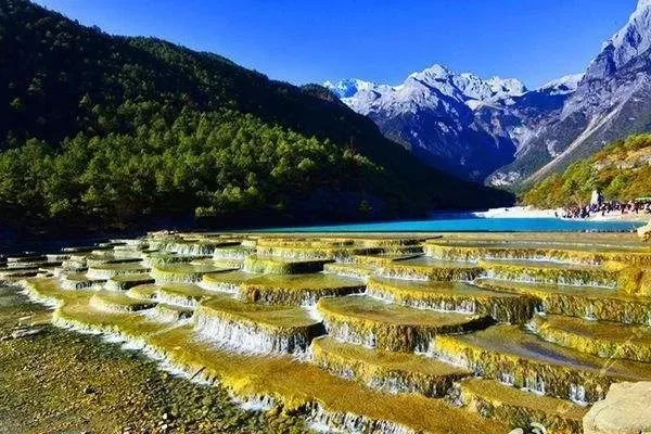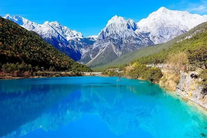 之后乘坐环线车前往游览【蓝月谷】。蓝月谷在晴天时,水的颜色是蓝色的,而且山谷呈月牙形,远看就像一轮蓝 色的月亮镶嵌在玉龙雪山脚下,有“小九寨”之称。