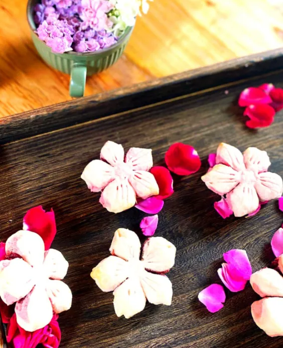 师傅们会耐心地指导我们如何制作。轻轻地揉圆球,擀面皮,放入玫瑰花馅,最后用模具压出形状,然后放进烤箱烤25分钟。刚刚出炉的鲜花饼,香气扑鼻,真的超级好吃!