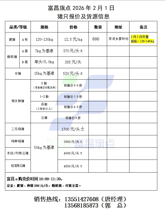 >富昌旗点2026年2月1日生猪价格及货源信息