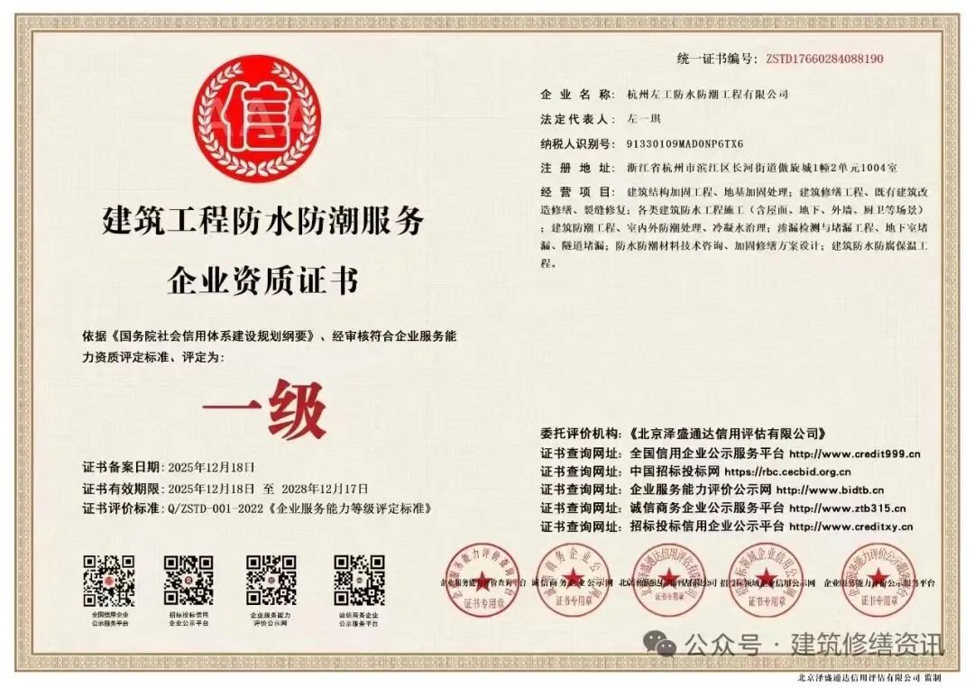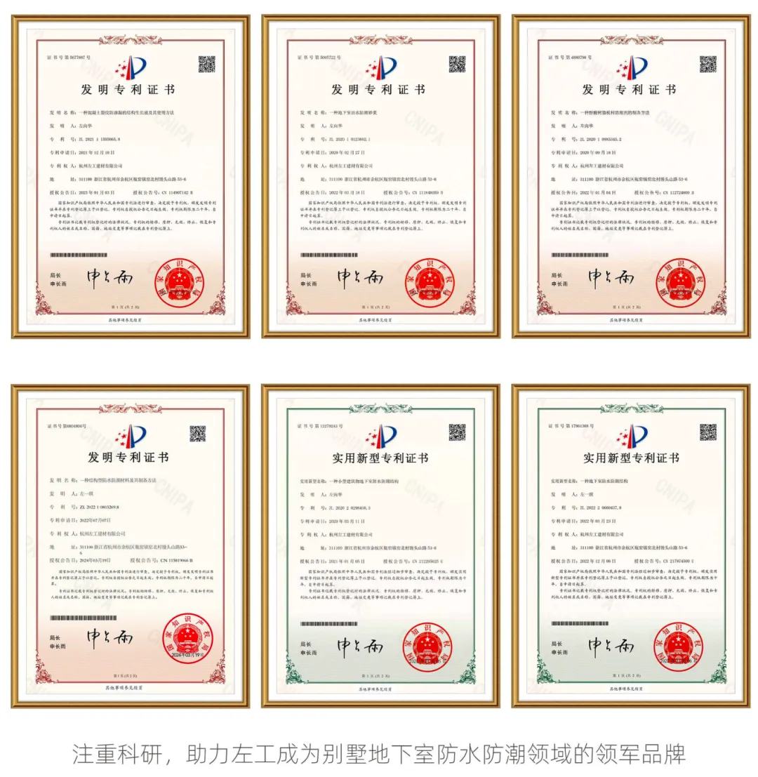 公司拥有国家6项发明专利”“别墅地下室防水防潮领域国家标准起草单位之一”“中国防水协会会员单位”“中央电视台上榜品牌”“太平洋保险公司1000万承保”“质量管理体系认证证书”“环境管理体系认证证书”“房屋防水防潮补漏服务企业一级资质”等一系列荣誉称号,承诺质保十年,并担任《建设工程渗漏治理手册》常务副主编。