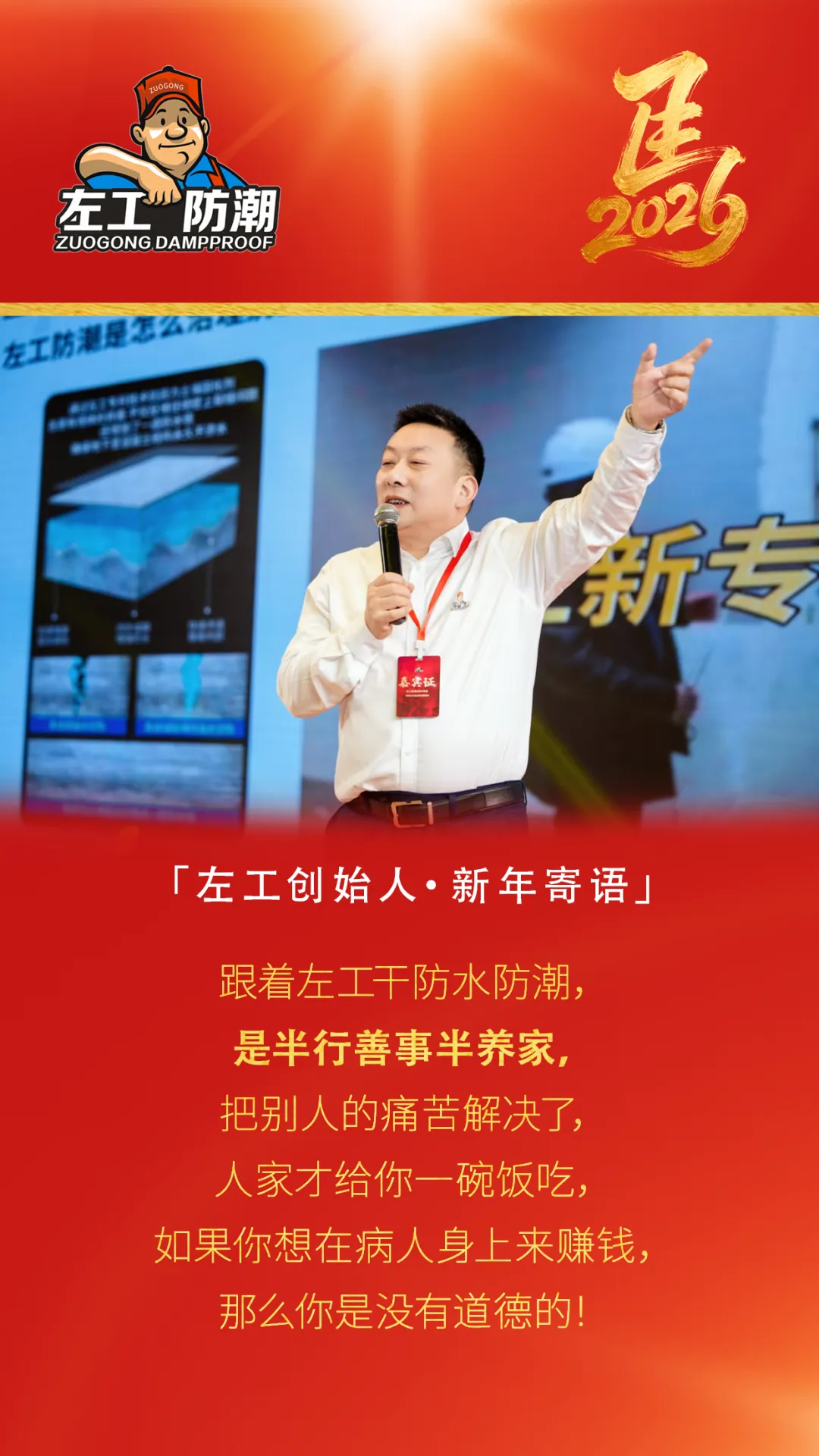 “人生如筑,基在防潮;企业如舟,我在掌舵。数十年沉淀,是经验,更是责任。未来之路,我将以技术为桨,以诚信为帆,以创新为风,带领左工防潮穿越市场波涛,在高质量发展的航道上,稳健前行,筑就百年品牌。