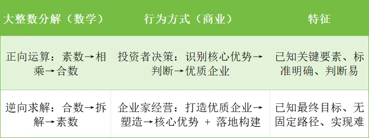 大整数分解法则清晰的说明了投资者相对于企业家所具备的优势:建立一个伟大企业(逆向创造关键要素)的难度,远大于识别一个伟大企业(挑选具有关键要素的企业)。