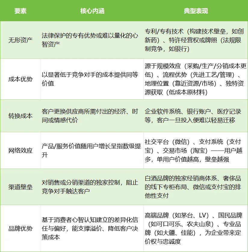 巴菲特常说的“护城河”,其实就是这些“素数”的商业化表达。它们是企业抵御竞争、实现长期超额回报的根本,我这里提炼为六大维度: