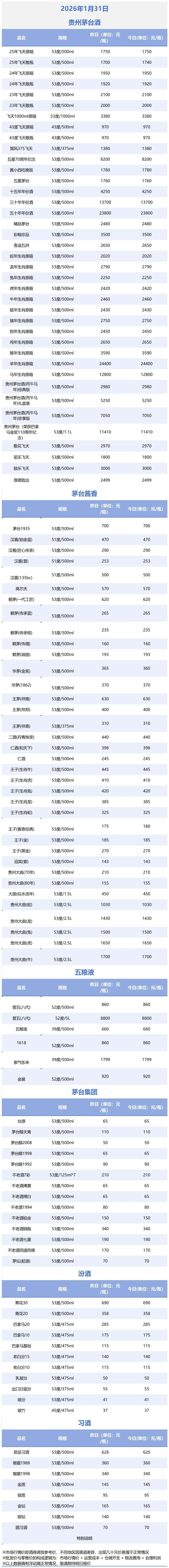 飞天价格回落!1月31日酒水价格行情...…