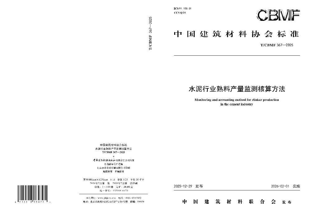 中国建筑材料联合会批准发布《水泥行业熟料产量监测核算方法》(T/CBMF 367-2025)。该标准于2025年12月29日公告发布,自2026年2月1日起实施。