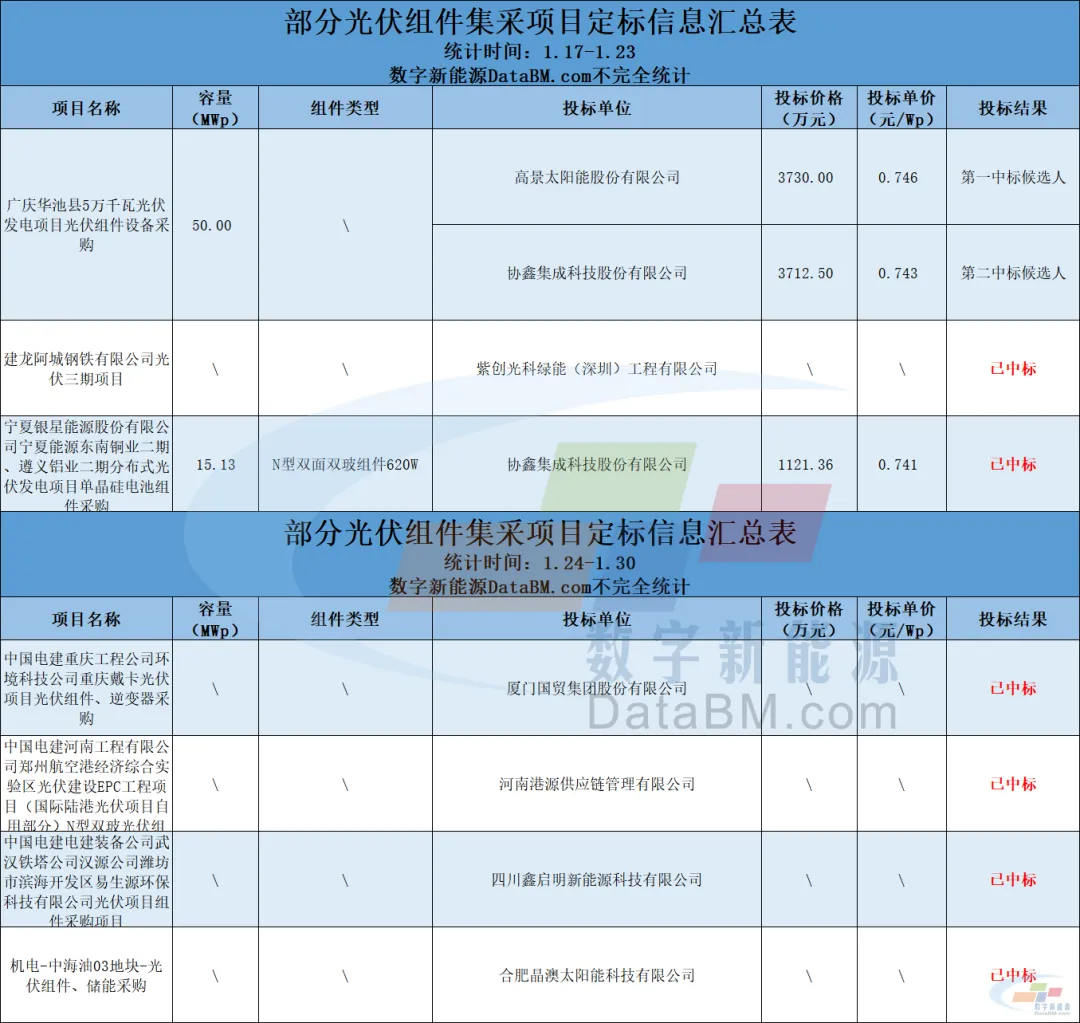 据数字新能源DataBM.com不完全统计,两周(1.17-1.30)已公示的光伏组件集采定标及入围项目容量仅有0.05GW,但光伏组件集采招标项目总量高达8.7GW。相比前两周(1.3-1.16),定标容量大幅下滑,招标项目总量大幅上升。