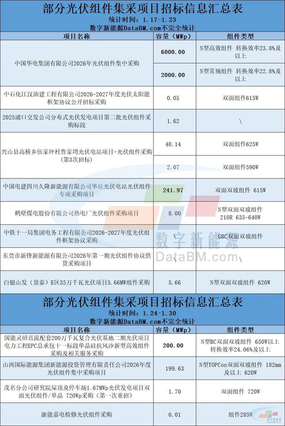 1月21日,华电集团发布2026年光伏组件集采项目,总计采购8GW组件,其中包含6GW的转换效率在23.8%及以上的N型高效组件,以及2GW的转换效率在22.8%及以上的N型常规组件。