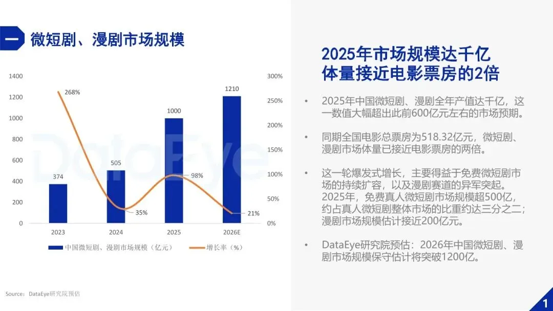 - 市场规模爆发式增长,千亿体量超越电影票房。2025 年微短剧、漫剧市场规模达 1000 亿元,接近电影票房的 2 倍,其中免费微短剧市场规模 533 亿元(同比 + 113%),占比达 2/3,漫剧市场规模接近 200 亿元。免费模式的爆发主要源于付费侧低迷、平台加码布局及抖音原生 IAA 模式增长,预计 2026 年市场规模将突破 1200 亿元。