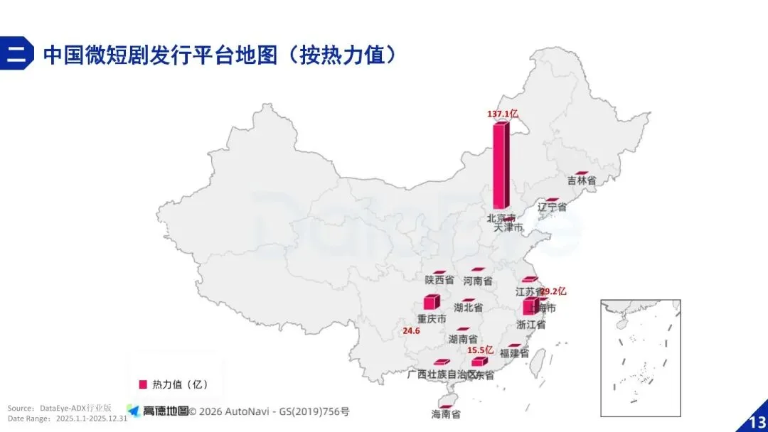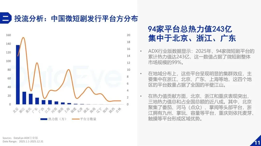 - 平台与制作方高度集中,区域集群效应显著。发行平台方面,番茄、河马、麦芽包揽 TOP3,贡献 60% 热力值,94 家平台集中于北京、浙江、广东;制作方方面,TOP100 累计热力值占比 6 成,陕西、河南、浙江成为核心产区。红果短剧表现突出,月活达 2.45 亿(反超优酷),用户日均使用时长破 120 分钟,免费模式下新剧贡献超 6 成热度。