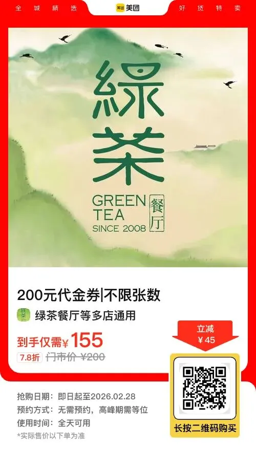 🎯立即抢购>> 节假日通用💥🔥【绿茶餐厅|200元代金券|不限张数