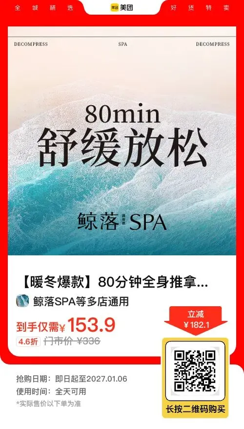 🔥【鲸落SPA【暖冬爆款】80分钟全身推拿按摩/热石精油SPA】多店通用