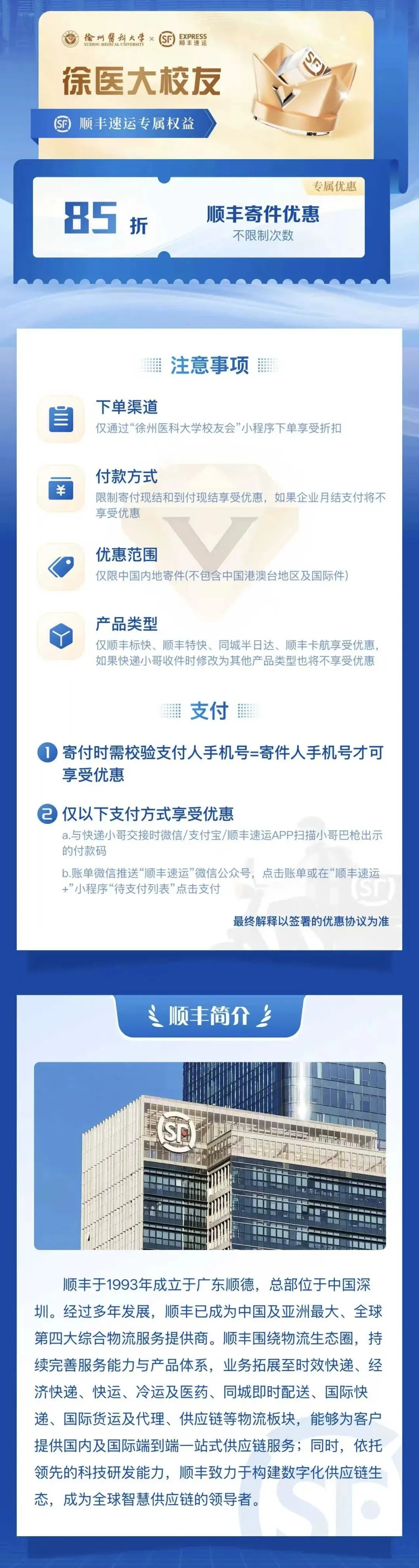 请通过“徐州医科大学校友总会”小程序服务大厅领取和使用顺丰速运专属权益。