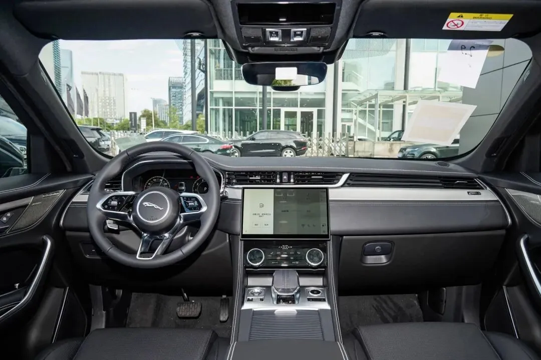 进车内我就开始摸了,捷豹这套内饰风格其实就是.偏运动中带点豪华的意.思,但.跟BBA比确实还是稍.微差点火候。中控.台上这块大屏反应还算.快,就是UI逻辑我觉得稍微有点乱,比如空调调节你.得翻两层菜单,驾驶中操作挺分神的。我现在.用指甲敲了.下.这个中控饰板,是硬塑料,下半段才是皮包的,这个价位这个用料我就不想多说了,明明可以做得更好。