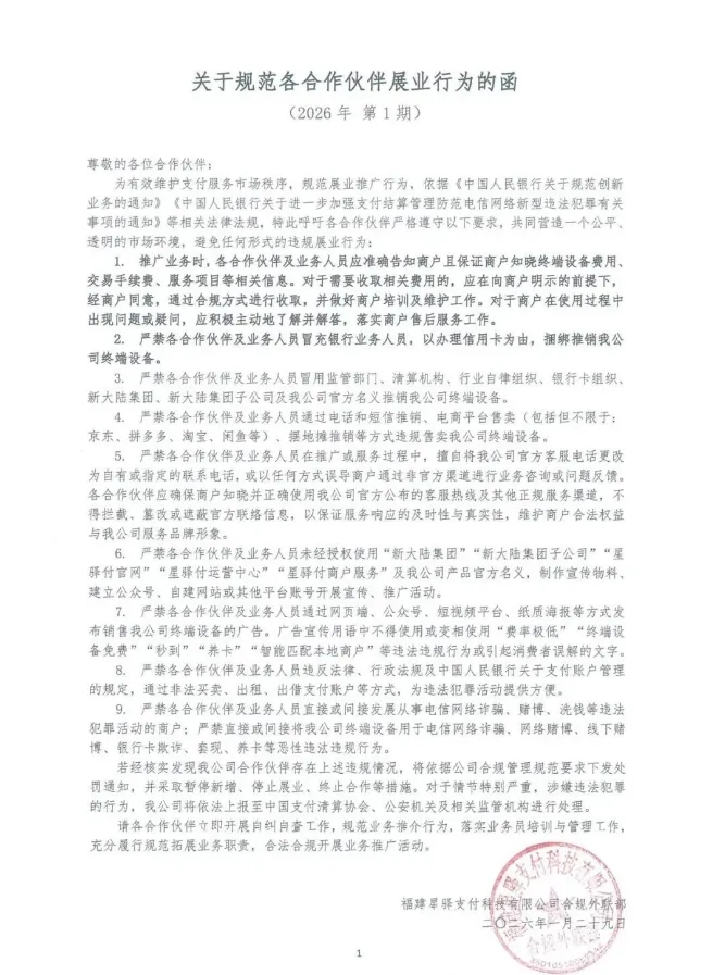 星驿支付在函件中明确要求合作伙伴禁止以下行为:
