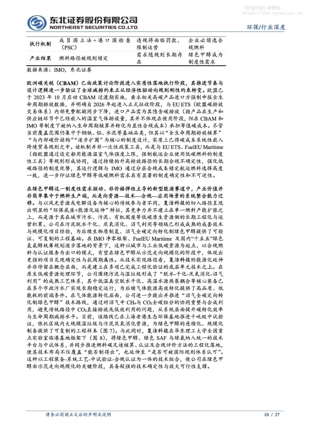 ►在产业参与者层面,绿色甲醇的产业价值并非简单集中于燃料生产端,而是向“资源-技术-合规-应用场景”的系统整合能力迁移。相关有代表性的环保企业,依托城市污水、污泥及有机固废等低碳原生资源,在工程化运营、系统集成及合规认证方面具备差异化优势,其布局更接近合规型能源基础设施提供方而非单一燃料制造商。在绿色甲醇由示范走向规模化的阶段中,这类以资源可控性与工程确定性为核心的模式,有望体现出更强的项目兑现能力与抗周期属性。