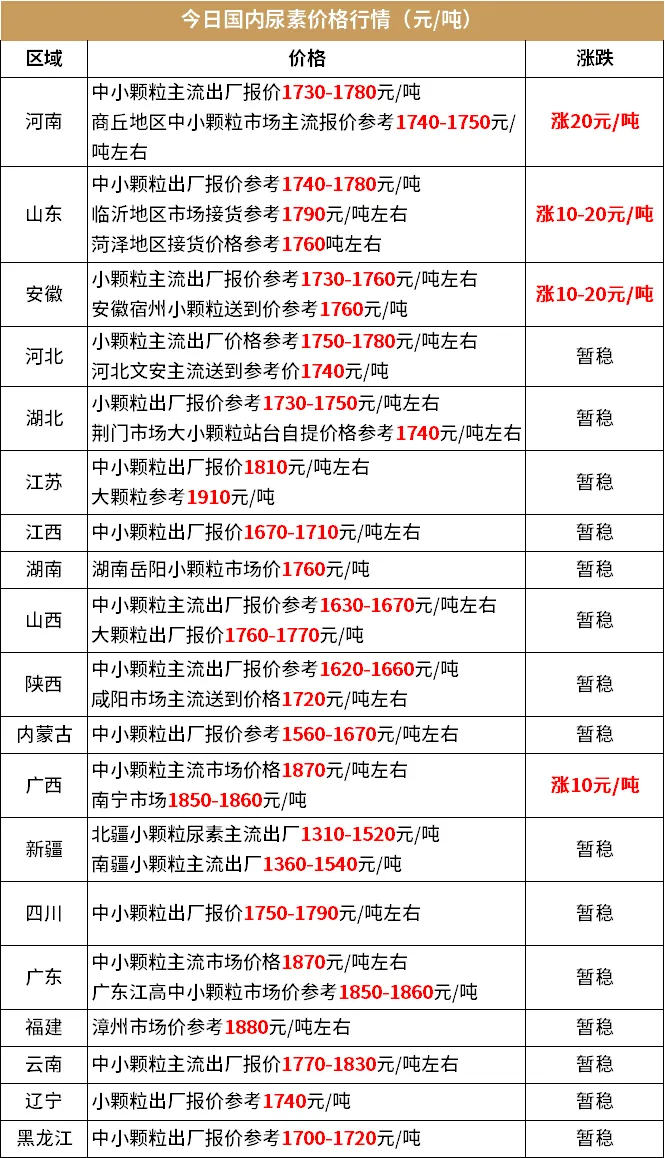 国内尿素现货价格普涨,市场情绪偏强带动企业收单情况改善,部分厂家凭待发订单小幅提价。尿素日产 20.67 万吨、开工率 87%,装置检修复产交替下整体供应充裕;冬春追肥季临近推动农业备肥启动,工业按需采购支撑成交,短期市场或震荡整理。