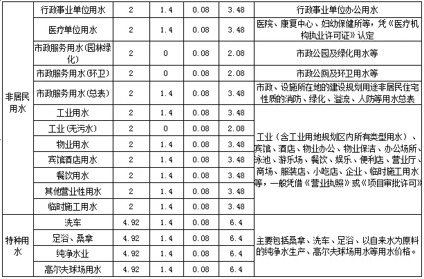 以下六类用水价格由原居民合表价格(2.9元/吨)调整为非居民用水价格(3.48元/吨):